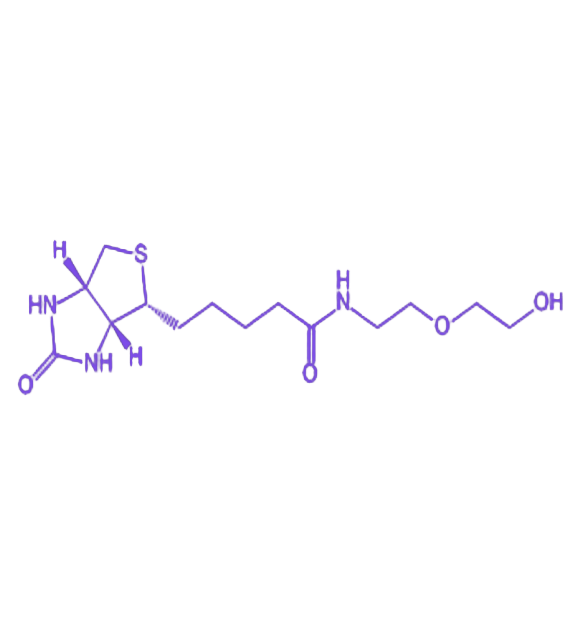 Biotin-PEG2-OH 是一种融合生物素高亲和力与 PEG2 亲水性及柔性间隔的功能化分子,由生物素(Biotin)、两单元聚乙二醇(PEG2)链段和末端羟基(-OH)组成,广泛应用于生物偶联、分子标记及纳米材料修饰领域。其核心优势在于生物素与链霉亲和素(Streptavidin)或亲和素(Avidin)的超强非共价键结合能力(结合常数达 10⁻¹⁵ M),以及 PEG2 链段对分子亲水性和柔性的提升,同时末端羟基为进一步化学修饰提供了反应位点。 该分子的化学结构设计赋予其多重特性:生物素作为小分子维生素,是生物分子标记与检测体系的核心连接单元,其与亲和素类蛋白的特异性结合为实验设计提供了高选择性基础;PEG2 作为短链聚乙二醇,有效增加生物素的水溶性,减少非特异性结合,并通过分子柔性促进结合过程的高效进行;末端羟基(-OH)可通过化学修饰引入羧基、氨基或叠氮基等活性基团,实现与药物、探针或纳米颗粒的偶联,从而扩展其在靶向药物递送、分子成像及诊断检测等领域的应用潜力。 在理化性质方面,Biotin-PEG2-OH 表现出良好的水溶性和化学稳定性,可溶于水、DMSO、DMF、甲醇等多种极性溶剂,操作便捷性高。为确保其活性稳定性,储存条件建议为 -20℃ 干燥、避光环境,需严格避免湿气和高温导致的降解或活性丧失。凭借简单的结构设计、优异的生物相容性及生物素-链霉亲和素系统的独特结合特性,Biotin-PEG2-OH 已成为分子生物学、纳米技术及医学研究中的关键连接分子,为构建高效生物偶联体系提供了可靠工具。