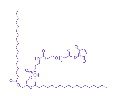 分子组成与结构特征 该化合物由三部分核心结构构成:两亲性的 DSPE(二硬脂酰基磷脂酰乙醇胺)作为结构基础,赋予其在水溶液中自发组装成脂质体等纳米结构的能力,为负载药物或生物分子提供稳定的载体框架;亲水性的 PEG6 链段(含6个重复单元的聚乙二醇)连接于 DSPE 末端,显著提升了化合物的水溶性,同时通过空间位阻效应降低纳米颗粒在体内的非特异性吸附,延长循环时间并减少被免疫清除的风险,从而增强载体的生物相容性与稳定性;末端的 马来酰亚胺(Mal)基团 作为核心活性位点,可在温和条件下与含巯基(-SH)的生物分子(如蛋白质、多肽、抗体片段等)发生特异性迈克尔加成反应,形成稳定的硫醚键,实现功能分子在载体表面的精准偶联。