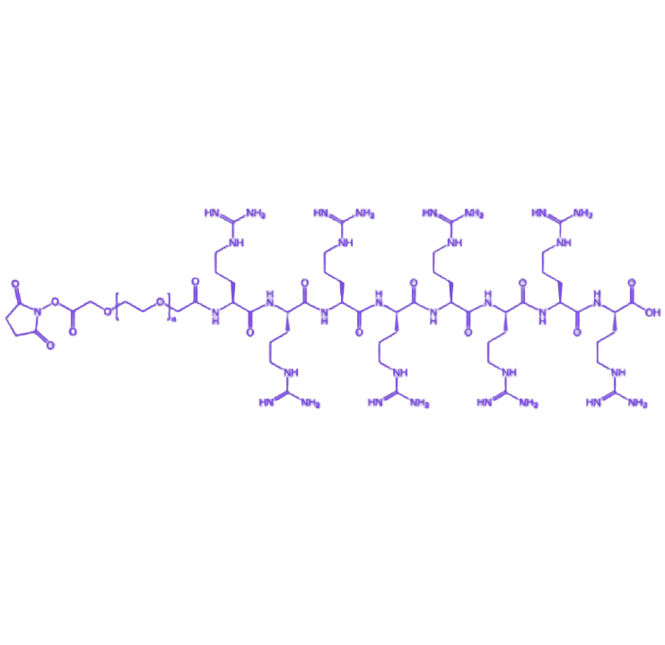 NHS-PEG-R8是一种由聚乙二醇(PEG)、活性酯基团(NHS)和靶向多肽 R8组成的功能性偶联分子,具备生物分子偶联、稳定性提升及细胞穿透等多重特性,在生物医学领域具有广泛的潜在应用价值。 NHS(N-羟基琥珀酰亚胺)作为分子的活性功能单元,通常位于链段的一端。其核心特性在于在中性至碱性pH条件下可与生物分子(如蛋白质、抗体、多肽等)表面的氨基发生特异性酰化反应,形成稳定的酰胺键,从而高效实现PEG-R8模块与目标生物分子的共价偶联,为生物分子的标记、修饰及功能化提供关键技术支撑。 PEG(聚乙二醇)作为分子结构的中间连接链段,凭借其优异的水溶性、生物相容性、链段柔性及低免疫原性,在体系中发挥多重调控作用。它不仅能显著提升偶联产物的化学稳定性和胶体稳定性,延长其在生物体内的循环半衰期,降低被网状内皮系统清除的风险,还可通过空间位阻效应减少生物分子之间的非特异性相互作用,对连接的功能单元起到物理保护作用。 R8(八聚精氨酸)是由八个连续精氨酸残基组成的阳离子型短肽序列,具有极强的细胞穿透能力。其作用机制主要通过与细胞膜表面带负电荷的磷脂或特定受体发生静电相互作用及受体介导的内吞作用,辅助整个偶联分子高效跨越细胞膜屏障进入细胞内部,这一特性使NHS-PEG-R8在细胞内药物递送、荧光成像探针构建及生物活性分子胞内转运等应用场景中展现出独特优势。