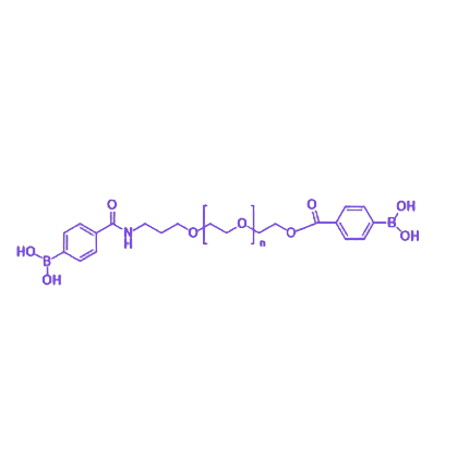 PBA-PEG-PBA(苯硼酸-聚乙二醇-苯硼酸)是一种具有双端苯硼酸(PBA)功能化修饰的线性嵌段共聚物,通过聚乙二醇(PEG)链段连接形成对称结构。该分子兼具苯硼酸基团的特异性识别能力与PEG链的生物相容性,在生物医学与材料科学领域展现出独特的应用潜力。 PBA-PEG-PBA的分子结构以亲水性PEG为主链,两端共价键合苯硼酸官能团,形成"A-B-A"型三嵌段结构。这种设计赋予分子良好的水溶性和稳定性,同时通过苯硼酸与顺式二醇基团的可逆共价结合特性,实现对含糖分子(如多糖、糖蛋白)的动态识别与响应。在水溶液中,该聚合物可通过调节pH值或糖浓度调控自组装行为,形成具有 stimuli-responsive特性的纳米组装体。其应用价值主要体现在靶向药物递送系统、生物传感器以及智能生物材料领域,尤其适用于需特异性识别糖基化生物分子或构建pH响应型载药平台的场景。