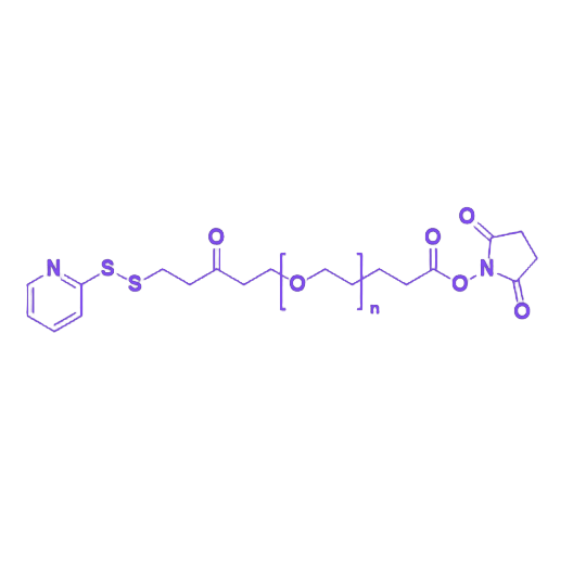 OPSS-PEG-SVA是一种功能性聚乙二醇衍生物,由邻二硫吡啶(OPSS)基团、聚乙二醇(PEG)链段和琥珀酰亚胺戊酸酯(SVA)基团通过共价键连接构成,在生物偶联化学和药物递送系统研究中具有重要应用价值。 该分子结构中,邻二硫吡啶基团(OPSS)可与巯基(-SH)发生特异性交换反应,形成稳定的二硫键,实现靶向偶联;琥珀酰亚胺戊酸酯(SVA)作为N-羟基琥珀酰亚胺(NHS)酯类衍生物,能高效活化羧基,与伯胺基团(-NH₂)在温和条件下反应生成酰胺键。聚乙二醇链段的引入可有效改善修饰后生物分子的水溶性、稳定性及生物相容性,降低免疫原性。该产品适用于蛋白质、多肽、抗体及纳米颗粒等生物活性物质的定点修饰,在构建靶向药物载体、制备抗体偶联药物(ADC)及生物分子功能化研究中展现出优异的应用性能。