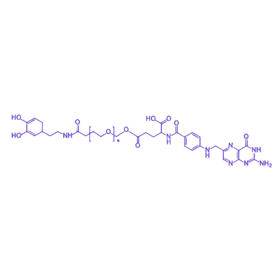 DA-PEG-FA(叶酸-聚乙二醇-多巴胺)是一种具有靶向功能的生物活性偶联物,通过共价键将叶酸(FA)、聚乙二醇(PEG)与多巴胺(DA)片段高效整合,在生物医学领域展现出独特的应用潜力。其设计结合了靶向识别、生物相容性与表面修饰多重特性,为药物递送及生物材料功能化提供创新解决方案。 该产品的分子结构以线性聚乙二醇链为核心骨架,一端通过酰胺键连接叶酸分子,另一端则修饰多巴胺基团,形成具有明确化学组成的三嵌段结构。这种精确的分子设计赋予其优异的水溶性和生物相容性,同时通过PEG链的空间位阻效应有效减少非特异性蛋白吸附。叶酸基团可特异性识别并结合细胞表面高表达的叶酸受体,实现靶向递送功能;而多巴胺的邻苯二酚结构则使其具备表面粘附性能,可通过自聚反应或与金属离子配位实现材料表面的功能化修饰。在应用层面,DA-PEG-FA可作为纳米载体的靶向修饰剂用于抗肿瘤药物递送,或作为表面功能分子构建仿生界面涂层,在组织工程、生物成像及诊断试剂开发等领域具有广泛应用前景。