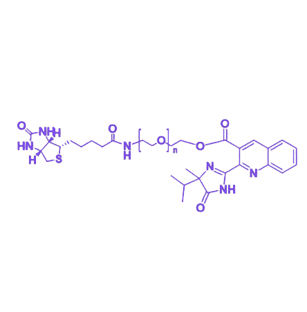 Biotin-PEG-Imazaquin(生物素-聚乙二醇-咪唑喹啉)是一种由生物素靶向单元、聚乙二醇链段与咪唑喹啉功能分子通过化学偶联形成的多功能生物活性探针。该分子设计整合了靶向识别、亲水性调节与生物活性激发等多重特性,为生物医学研究提供了高效的分子工具。 该化合物的分子结构包含三个关键功能模块:末端的生物素基团可通过与链霉亲和素的特异性结合实现靶向递送,中间的聚乙二醇(PEG)链段能有效改善分子水溶性并减少非特异性相互作用,而另一端的咪唑喹啉结构则赋予其免疫调节活性。在物化性质方面,该共轭物通常表现出良好的水相分散性,其分子量可通过PEG链长调控,动态光散射(DLS)检测显示纳米级水合粒径分布均匀。在应用价值上,该探针可广泛用于免疫治疗研究中的靶向激活、细胞成像分析以及药物递送系统开发,尤其在树突状细胞激活、 toll样受体(TLR)信号通路研究等领域展现出独特优势,为探索免疫调控机制与开发新型生物制剂提供了有力支持。