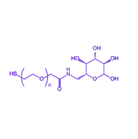 Gala-PEG-SH(半乳糖-聚乙二醇-巯基)是一种功能性生物共轭分子,通过将半乳糖靶向基团与聚乙二醇(PEG)柔性链及巯基反应基团共价连接,在生物医学领域展现出独特的应用价值。其设计兼顾了靶向识别能力与生物相容性,为药物递送、生物成像等场景提供了高效的分子工具。 该化合物的分子结构以线性聚乙二醇链为核心骨架,一端通过糖苷键连接半乳糖残基,另一端修饰活性巯基(-SH)基团。这种结构赋予分子双重功能:半乳糖单元可通过与细胞表面的半乳糖受体特异性结合实现靶向递送,而巯基则能与金纳米颗粒、量子点等材料表面的金属原子形成稳定的Au-S共价键,实现生物分子的高效固定。在物化性质方面,聚乙二醇链段的引入有效提升了分子的水溶性和生物相容性,降低了免疫原性,同时其柔性结构可减少空间位阻效应,确保靶向配体与受体的高效识别。该产品在纳米载药系统构建中可作为靶向修饰剂,通过调控PEG链长和半乳糖取代度,优化载体的靶向效率和循环半衰期;在生物传感领域,其巯基末端可介导纳米探针的功能化修饰,实现对特定细胞或生物分子的高灵敏度检测。