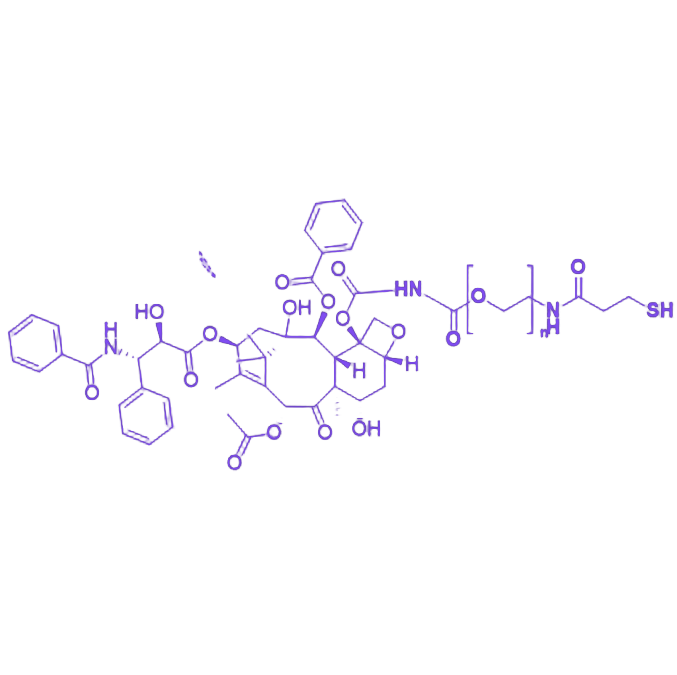 SH-PEG-PTX(巯基-聚乙二醇-紫杉醇)是一种通过化学偶联技术构建的靶向药物递送系统,兼具紫杉醇的抗肿瘤活性与聚乙二醇的生物相容性优势。该共轭物通过巯基(-SH) 基团实现与生物分子的特异性反应,为药物控释及靶向递送研究提供了高性能载体。 分子结构上,该化合物由疏水性紫杉醇(PTX)通过共价键连接至亲水性聚乙二醇(PEG)链段末端,另一端修饰有巯基功能基团,形成双亲性嵌段结构。其物化性质表现为良好的水溶性和胶体稳定性,可通过自组装形成纳米粒,有效改善紫杉醇的生物利用度并降低毒副作用。在应用价值方面,该共轭物在肿瘤治疗领域展现出靶向递送潜力,巯基基团可特异性偶联靶向配体或响应性材料,实现药物在病灶部位的精准释放,为新型抗肿瘤药物制剂的研发提供关键材料支持。