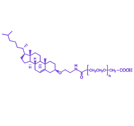 Cholesterol-PEG-COOH(胆固醇-聚乙二醇-羧基)是一种兼具脂溶性与水溶性的多功能生物材料,通过胆固醇基团与聚乙二醇链段的共价连接,实现了对生物膜亲和性与生物相容性的协同调控。该化合物在药物递送、生物成像及生物分子修饰领域具有重要应用潜力。 Cholesterol-PEG-COOH分子结构由三部分构成:疏水性的胆固醇基团、亲水性的聚乙二醇(PEG)链段以及末端的羧基(-COOH)活性官能团。胆固醇单元赋予分子与细胞膜的特异性相互作用能力,而PEG链段则通过空间位阻效应有效提升材料的血液循环稳定性,并降低非特异性蛋白吸附。羧基末端可通过酰胺键或酯键与含氨基或羟基的生物分子(如药物、肽段、抗体等)进行高效偶联,构建靶向递送系统。该化合物通常呈现白色至类白色粉末状,易溶于水及部分有机溶剂,其理化性质可通过调节PEG分子量(常用范围500-10000 Da)实现精准调控,为不同应用场景提供定制化解决方案。