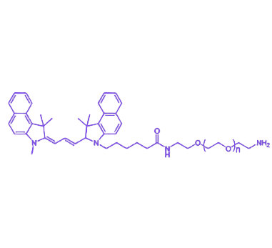 Cy3.5-PEG-NH2是一种由花菁染料Cy3.5与聚乙二醇(PEG)链及氨基(-NH2)基团共价连接形成的功能性生物共轭材料,兼具荧光标记能力与生物相容性。其独特的分子设计使其在生物分子标记、成像分析及药物递送系统中具有广泛应用前景。 该产品的分子结构以线性PEG链为亲水骨架,一端通过稳定的化学键连接Cy3.5荧光团,另一端修饰有高反应活性的氨基基团,可与羧酸、活性酯等官能团发生高效偶联反应。Cy3.5作为近红外荧光染料,具有斯托克斯位移大、光稳定性强及组织穿透深度优异的特性,适用于活体成像及高灵敏度检测。PEG链段的引入有效提升了材料的水溶性和生物相容性,降低了非特异性结合,而末端氨基的化学活性使其能够实现与蛋白质、多肽、抗体等生物分子的精准偶联,在荧光免疫分析、细胞示踪、药物靶向递送等领域展现出重要应用价值。