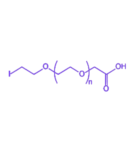 I-PEG-COOH(碘-聚乙二醇-羧基)是一类兼具碘标记功能与羧酸活性基团的功能性高分子材料,其分子结构中的碘原子赋予材料可检测特性,而末端羧基则提供了与生物分子偶联的反应位点,在生物成像与药物递送领域具有重要应用潜力。 该化合物以线性聚乙二醇(PEG)为主链,一端通过共价键连接碘原子作为 放射性或造影标记基团,另一端修饰有羧基(-COOH)活性官能团。其独特的双亲性结构使其在水溶液中具有良好的分散性,同时PEG链段的空间位阻效应可有效减少非特异性相互作用。在物化性质上,该材料表现出优异的生物相容性和稳定性,碘标记效率可通过调节反应条件实现精准控制,羧基则可通过酰胺化、酯化等反应与含氨基或羟基的生物分子(如抗体、多肽、药物分子)高效偶联。这种结构设计使I-PEG-COOH在 核医学成像(如SPECT/PET)、光声成像以及靶向药物载体构建中展现出显著优势,为疾病诊断与治疗一体化研究提供了关键的材料基础。