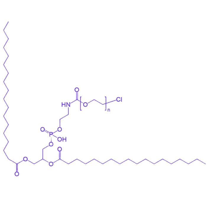 该化合物的分子结构以1,2-二硬脂酰基-sn-甘油-3-磷酸乙醇胺(DSPE)为疏水端,通过磷酸乙醇胺基团与聚乙二醇(PEG)链段共价连接形成双亲性结构,PEG末端修饰有高反应活性的氯化物基团(-Cl)。这种独特的结构设计赋予产品优异的两亲性,可自组装形成稳定的纳米胶束或脂质体结构,同时PEG链段的空间位阻效应能有效减少网状内皮系统清除,延长纳米颗粒的体内循环时间。在物化性质方面,产品通常呈现白色至类白色粉末状,易溶于三氯甲烷、甲醇等有机溶剂,在水性缓冲液中可分散形成胶体溶液,其临界胶束浓度(CMC)与PEG分子量呈负相关。氯化物末端作为关键反应位点,可在温和条件下与伯胺、仲胺等亲核试剂发生亲核取代反应,实现靶向配体、荧光分子或治疗性药物的定点偶联,这种<强>可控共价修饰特性强>使其在构建多功能纳米递送系统中展现出显著优势。在应用价值层面,该材料不仅可用于制备长循环脂质体以提高化疗药物的肿瘤靶向递送效率,还可通过表面修饰抗体、适配体等靶向分子实现主动靶向递送,在肿瘤精准治疗、分子影像诊断及生物传感等领域具有重要的科研价值与应用前景。