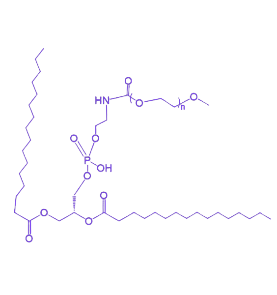 DPPE-mPEG(二棕榈酰磷脂酰乙醇胺-甲氧基聚乙二醇)是一种由磷脂与聚乙二醇链段通过共价键缀合形成的功能性两亲性材料,广泛应用于药物递送系统的构建与生物相容性表面修饰。其分子设计兼顾了脂质双分子层的组装特性与聚乙二醇的空间位阻效应,为纳米载体的稳定性提升与长循环功能实现提供了关键支撑。 该化合物的分子结构由两部分构成:疏水端为二棕榈酰磷脂酰乙醇胺(DPPE),包含两条棕榈酸长链与磷酸乙醇胺极性头部;亲水端通过酰胺键连接甲氧基聚乙二醇(mPEG)链段,形成典型的"脂质-聚合物"嵌段结构。这种双亲性特征使其在水溶液中可自组装形成具有 核-壳结构 的纳米粒,疏水内核能有效包载脂溶性药物,而表面PEG链段通过 空间位阻效应 显著降低网状内皮系统清除率,延长体内循环时间。在物化性质方面,该材料表现出良好的膜融合性与可修饰性,其临界胶束浓度(CMC)较低,确保纳米制剂在稀释条件下仍保持结构稳定。在应用价值上,DPPE-mPEG修饰的纳米载体不仅能提升药物的生物利用度,还可通过调节PEG分子量(如2000、5000等常用规格)实现对载体表面性能的精准调控,在抗肿瘤药物靶向递送、基因治疗载体优化等领域展现出重要的研究与产业化潜力。