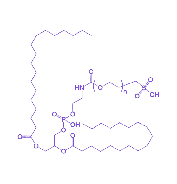 DSPE-PEG-Mesylate(二硬脂酰基磷脂酰乙醇胺-聚乙二醇-甲磺酸酯)是一种由磷脂、聚乙二醇链与甲磺酸酯基团共价偶联形成的功能性生物材料,兼具双亲性分子特性与靶向修饰潜能,广泛应用于药物递送系统与生物分子偶联领域。 该化合物分子结构以1,2-二硬脂酰基-sn-甘油-3-磷酸乙醇胺(DSPE)为疏水端,通过磷酸酯键连接亲水性聚乙二醇(PEG)链段,末端修饰活性 甲磺酸酯基团(-OSO₂CH₃)。这种三嵌段结构赋予其良好的两亲性,可在水溶液中自组装形成稳定的脂质体或胶束,临界胶束浓度(CMC)低至10⁻⁶-10⁻⁸ mol/L,展现出优异的胶体稳定性。其 聚乙二醇链段 可有效降低载体系统的免疫原性与网状内皮系统清除率,延长血液循环时间;而末端甲磺酸酯作为强离去基团,能与含氨基、巯基的生物分子发生高效亲核取代反应,实现药物分子或靶向配体的定点偶联。在应用中,该材料通过调节PEG分子量(常用范围500-10000 Da)与DSPE比例,可精准调控载体粒径(20-200 nm)及表面性能,适用于抗肿瘤药物、基因治疗载体及诊断试剂的模块化构建,尤其在 主动靶向递送系统 的表面功能化修饰中表现出独特优势。