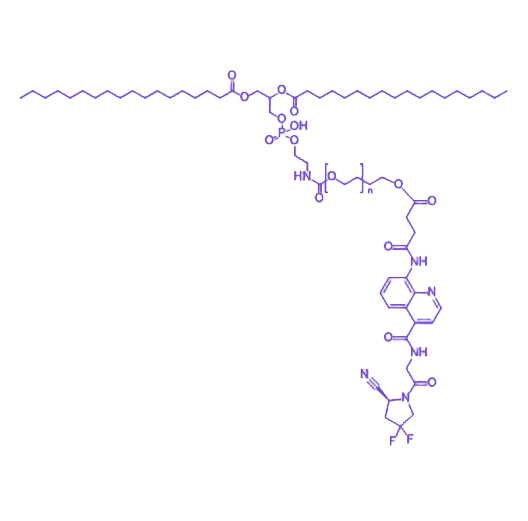 该产品分子结构以DSPE作为脂质锚定单元,通过PEG链段的柔性连接臂实现与OncoFAP靶向基团的稳定结合,形成具有明确两亲性的线性分子架构。DSPE部分赋予材料在水性介质中自组装形成纳米载药体系的能力,PEG链的引入可有效降低纳米颗粒的免疫原性并延长体内循环时间,而OncoFAP靶向配体则通过与肿瘤微环境中过表达的FAP(成纤维细胞活化蛋白)特异性结合,实现药物在病变部位的选择性富集。在物化性质方面,该偶联物表现出良好的水分散性和胶体稳定性,其临界胶束浓度(CMC)处于微摩尔级别,可通过动态光散射(DLS)和透射电镜(TEM)表征其自组装行为。在应用价值上,该材料可广泛用于构建靶向纳米载药系统,尤其适用于FAP阳性肿瘤的化疗药物、光动力治疗试剂或基因递送载体的开发,通过增强药物在肿瘤组织的穿透与滞留效应,提升治疗效果并降低对正常组织的毒副作用。其模块化设计也为不同分子量PEG链段或靶向配体的替换提供了灵活性,满足多样化的科研与应用需求。