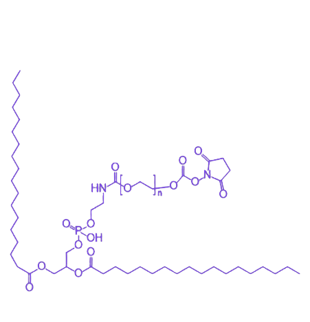 该化合物分子结构由三部分构成:疏水端为两条C18饱和脂肪酸链组成的二硬脂酰基磷脂酰乙醇胺(DSPE),赋予材料在水性介质中自组装形成脂质双分子层的能力;亲水头端通过磷酸酯键连接聚乙二醇(PEG)柔性链,可有效降低纳米颗粒的蛋白吸附与网状内皮系统清除;PEG末端修饰的琥珀酰亚胺乙酸酯(SCM)基团则提供了与氨基(-NH₂)的高效共价偶联位点,在中性pH条件下即可发生酰胺化反应,实现抗体、肽段等靶向配体的定点修饰。其典型理化特性包括临界胶束浓度(CMC)低于10⁻⁵ mol/L,在磷酸盐缓冲液中可形成粒径均一的脂质体或胶束结构,zeta电位通常介于-15至-30 mV之间,具有良好的胶体稳定性。在应用层面,该材料通过调节PEG分子量(常用范围500-10000 Da)可定制载药系统的隐形效果,而SCM基团的高效靶向偶联效率使其在构建主动靶向纳米药物中展现突出优势,尤其适用于肿瘤微环境响应型递送系统及免疫治疗药物的载体改造,目前已在阿霉素、紫杉醇等小分子化疗药物的纳米制剂研究中实现药物包封率提升与体内抗肿瘤活性增强。