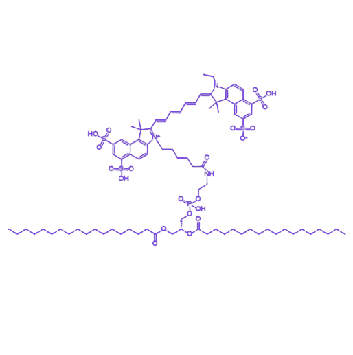 DSPE-CY7.5是一种由疏水性二硬脂酰磷脂酰乙醇胺(DSPE)与亲水性CY7.5荧光染料结合而成的功能性复合物,其独特的两亲性结构使其在生物医学领域具有广泛应用价值。该复合物通过自组装形成稳定纳米结构,可用于生物分子标记及药物载体构建,同时借助近红外荧光特性实现生物成像,为疾病研究与诊疗提供可视化工具。 DSPE-CY7.5的分子结构具有明确的两亲性特征:DSPE组分的两条长链脂肪酸链构成疏水性内核,而CY7.5荧光染料的磺酸根基团则形成亲水性外壳。这种结构赋予其在水溶液中自发组装的能力,通过疏水相互作用形成胶束或脂质双层结构,疏水部分聚集形成核心,亲水部分暴露于水相,从而构建热力学稳定的纳米级载体系统。 在生物分子标记应用中,DSPE-CY7.5可通过共价键修饰与蛋白质、核酸等生物分子结合,该过程不会影响生物分子的原有生物活性,确保标记后分子的功能完整性。在药物递送领域,其形成的脂质双层结构能够有效包载mRNA或DNA疫苗,利用脂质膜的膜融合特性实现遗传物质向靶细胞的高效递送,为基因治疗提供载体支持。 CY7.5荧光染料的光学特性是该复合物的核心优势之一,其发射波长处于750-800nm近红外波段,该波段的光在生物组织中具有散射系数低、吸收弱的特点,组织穿透深度可达数厘米,显著降低生物背景荧光干扰。在肿瘤研究中,标记DSPE-CY7.5的纳米颗粒可通过增强渗透和滞留效应(EPR效应) 富集于肿瘤组织,借助近红外荧光成像技术实现肿瘤生长动态监测及药物在体内的分布追踪,为癌症的早期诊断和治疗效果评估提供直观的可视化依据。