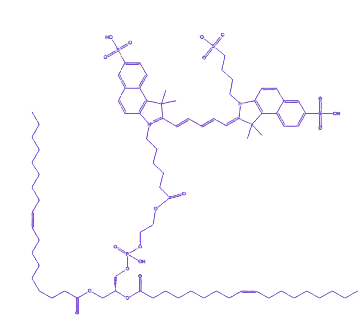 DOPE-CY5.5是一种将CY5.5荧光染料与二油酰磷脂酰乙醇胺(DOPE)结合的功能性分子,也可称为CY5.5-DOPE或菁染料CY5.5标记磷脂。其核心组成包括DOPE、聚乙二醇(PEG)(部分情况下可不包含)及CY5.5荧光染料,主要用于构建兼具生物靶向与荧光示踪功能的生物载体系统。 DOPE作为磷脂类化合物,具备优异的生物相容性和细胞膜亲和性,是脂质体、纳米颗粒等生物载体的常用构建单元,可通过自组装形成稳定的双层膜结构,为药物递送或分子探针提供载体骨架。 CY5.5作为近红外荧光染料,发射波长范围为680nm至710nm,该波段光具有较强的深层组织穿透能力,可有效减少生物组织自发荧光干扰,显著提升检测信号的灵敏度,适用于活体成像、细胞示踪等生物医学研究场景。 PEG(若包含)作为合成聚合物,具有良好的水溶性和生物相容性,其引入可增加复合物的亲水性,减少非特异性蛋白吸附,延长体内循环时间,进一步优化载体系统的理化性质和生物安全性。