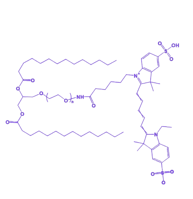 DMG-PEG-Cy5 是一种集亲脂性、生物相容性与荧光示踪功能于一体的荧光标记复合物,由二肉豆蔻酰甘油(DMG)、聚乙二醇(PEG)和花菁染料 Cy5 通过化学修饰连接而成,广泛应用于生物医学及生物技术领域的细胞成像、生物分子标记与体内荧光示踪研究。其核心优势在于利用 DMG 的膜相互作用特性促进细胞摄取,PEG 链段的空间位阻效应延长体内循环时间,以及 Cy5 在近红外区域的优异光学性能实现高灵敏度检测,为追踪复合物在生物体内的动态分布与代谢过程提供可靠的可视化手段。