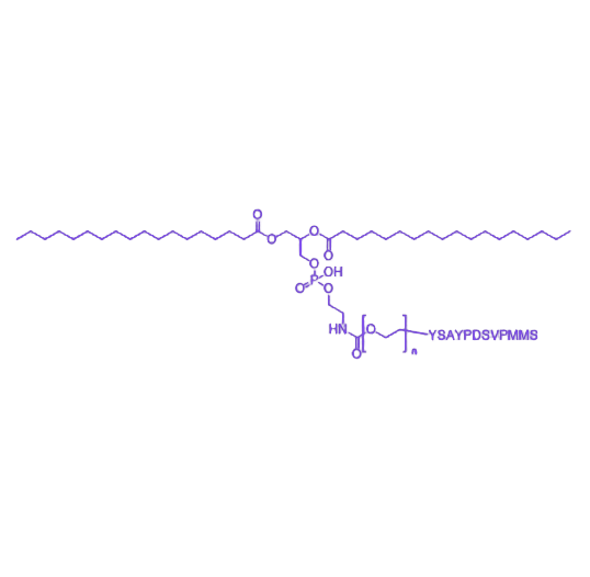 DSPE-PEG-YSAYPDSVPMMS 是一种由 1,2-二硬脂酰磷脂酰乙醇胺(DSPE)、聚乙二醇(PEG)和 YSAYPDSVPMMS 靶向肽组成的功能化脂质-聚合物复合物,在生物医药研究领域具有重要应用价值。其核心设计在于利用各组分的协同作用,构建兼具结构稳定性、生物相容性与靶向识别能力的载体系统,为药物递送及相关生物医学研究提供高效工具。