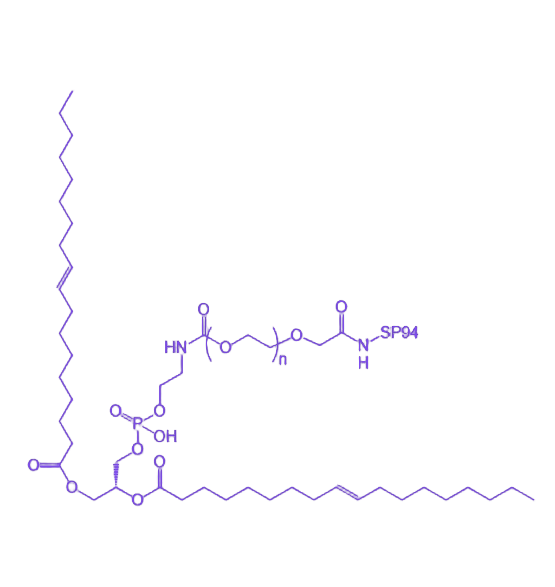 DOPE-PEG-SP94(二油酰基磷脂酰乙醇胺-聚乙二醇-SP94肽)是一种由DOPE(二油酰基磷脂酰乙醇胺)、PEG(聚乙二醇)和SP94肽共价偶联形成的多功能生物材料,集成了天然磷脂的生物相容性、亲水性聚合物的理化调节功能及靶向肽的分子识别特性,在生物医学领域具有广泛的应用潜力。