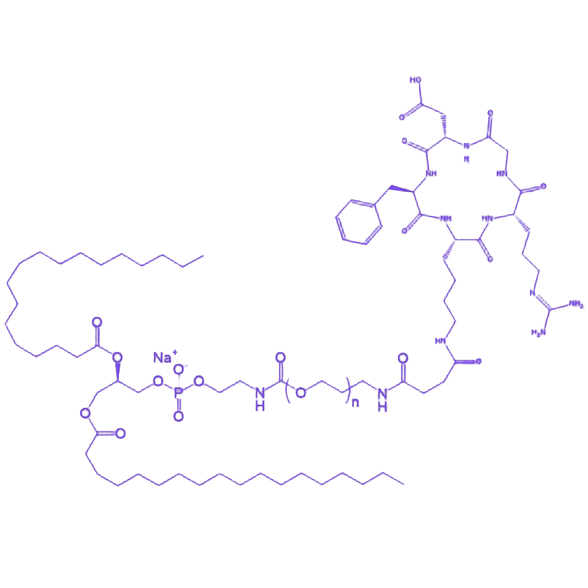 DSPE-PEG-cRGDfK是一种由磷脂、聚乙二醇和亲水性靶向肽段偶联形成的功能性生物材料,其结构设计整合了脂质双分子层亲和性、生物相容性增强及主动靶向识别等多重特性,适用于纳米递药系统的构建与优化。 DSPE(二硬脂酰基磷脂酰乙醇胺)作为分子骨架的脂质组分,通过其疏水烷基链与脂质双层膜的相互作用,赋予材料在脂质体或纳米颗粒中的稳定嵌入能力,为载体系统提供结构基础。PEG(聚乙二醇)片段通过亲水性修饰,可显著提升材料的生物相容性和胶体稳定性,同时减少网状内皮系统的识别与清除,延长纳米递送系统在体内的循环时间。cRGDfK作为环状RGD多肽衍生物,通过特异性识别靶点细胞表面的整合素受体,实现对病变组织的主动靶向递送,提高药物在靶部位的富集效率,降低对正常组织的毒副作用。三者的协同作用使该材料在肿瘤治疗、分子影像及靶向递药等生物医学领域具有重要应用潜力。