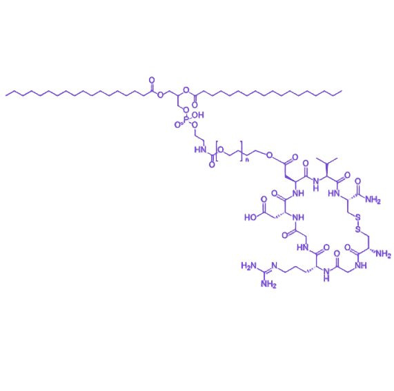 DSPE-PEG-LXW7是一种由磷脂(DSPE)、聚乙二醇(PEG)与LXW7多肽序列共价偶联形成的多功能生物材料,可作为靶向纳米载体构建单元应用于药物递送系统。其通过整合磷脂的膜嵌入特性、PEG的亲水性修饰功能及多肽的受体识别能力,实现对肿瘤部位的精准药物递送与高效治疗。 该复合物的磷脂骨架(DSPE) 具有典型两亲性结构,其亲水头部与疏水尾部可稳定嵌入脂质体或纳米粒的膜结构,为载体提供刚性支撑并提升药物包封效率。聚乙二醇(PEG)链段通过空间位阻效应形成亲水保护层,显著降低纳米载体与血浆蛋白的非特异性相互作用,减少网状内皮系统的清除率,从而延长体内循环半衰期,提高病变组织的被动靶向积累。 关键功能单元LXW7多肽可特异性识别并结合肿瘤细胞高表达的整合素αvβ3受体,通过受体介导的主动靶向机制,使载药纳米颗粒在肿瘤微环境富集,降低对正常组织的毒副作用。该材料适用于构建脂质体、纳米胶束等多种纳米递送系统,在抗肿瘤药物、基因治疗载体等领域具有潜在应用价值,尤其适用于需要提高肿瘤部位药物浓度的治疗场景。