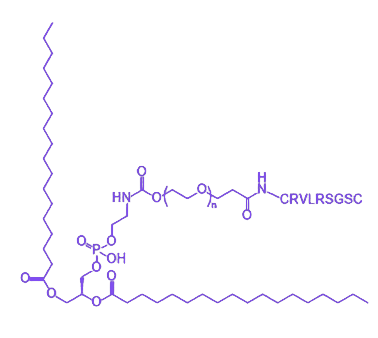 该材料的核心组成包括 DSPE(1,2-二硬脂酰-sn-甘油-3-磷酸乙醇胺)、PEG(聚乙二醇) 和 CRVLRSGSC 肽。其中,DSPE 作为饱和 18 碳磷脂,具有双亲性特征,可自组装形成脂质双层结构,是构建脂质体载体的关键基础成分,赋予材料良好的生物膜兼容性,有助于提升其在体内环境中的分散稳定性。PEG 作为亲水性聚合物链段,连接于 DSPE 与 CRVLRSGSC 肽之间,主要发挥三大作用:一是延长材料在体内循环的半衰期,减少网状内皮系统的清除;二是通过空间位阻效应降低非特异性蛋白吸附及细胞黏附;三是增加分子整体水溶性,优化材料的药代动力学参数。CRVLRSGSC 肽作为功能性基团,基于其结构特性推测可通过与特定细胞表面受体的特异性结合,实现对靶细胞的精准识别与相互作用,为材料赋予细胞靶向功能,在疾病诊断试剂开发、靶向药物递送系统构建等场景中具备应用潜力,尽管目前公开研究中对该肽段的具体生物学功能及作用机制尚未完全明确。