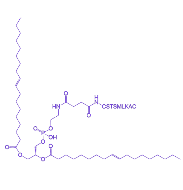 DOPE-CSTSMLKAC 是由二油酰基磷脂酰乙醇胺(DOPE)与特定多肽序列 CSTSMLKAC 通过化学连接形成的功能性化合物,其核心优势在于融合了 DOPE 的 脂质组装特性 与 CSTSMLKAC 多肽的 氨基酸功能多样性,在生物膜模拟、药物载体构建及生物分子功能化等领域具有重要应用潜力。
