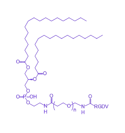 DSPE-PEG-RGDV 是一种由 二硬脂酰磷脂酰乙醇胺(DSPE)、聚乙二醇(PEG)与 RGDV 肽共价连接形成的多功能生物靶向载体材料,具备药物包载、长循环及主动靶向三重核心功能,在肿瘤治疗与生物成像领域展现出显著应用价值。