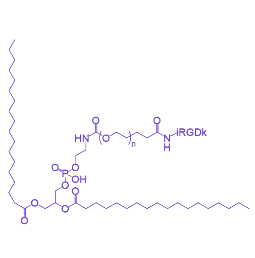 二硬脂酰基磷脂酰乙醇胺-PEG-iRGDk 肽是一种由 二硬脂酰基磷脂酰乙醇胺(DSPE)、聚乙二醇(PEG)和 iRGDk 肽通过化学偶联形成的功能性生物材料复合物,主要用于构建具有靶向递送能力的药物载体系统。其设计整合了磷脂的自组装特性、PEG的生物相容性修饰功能以及靶向肽的特异性识别能力,可有效提升药物递送的效率与精准性。