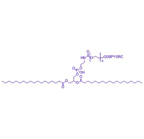 结构组成与理化特性:该复合物以两亲性磷脂DSPE为基础骨架,其疏水链段可自组装形成脂质体、纳米颗粒或胶束等载体结构,为药物包载提供基础。PEG链段通过共价连接修饰于载体表面,形成亲水性保护层,显著降低单核-巨噬细胞系统(MPS)的识别与清除,延长载体在血液循环中的半衰期。GGSPYGRC多肽序列作为靶向配体,通过与特定细胞表面受体的特异性结合,赋予载体主动靶向能力,提升药物在病变部位的富集效率。