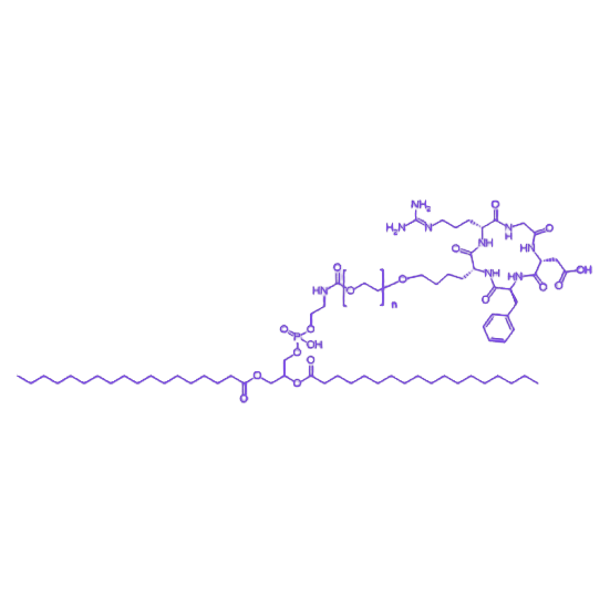 该分子的多组分协同作用使其成为构建主动靶向纳米递药系统的理想工具:脂质核心实现疏水药物的高效包载,PEG链段优化药代动力学行为,环肽配体介导载体向病变部位的精准递送,三者共同提升药物在靶组织的蓄积浓度,降低对正常器官的毒副作用。其化学结构的可修饰性允许通过调整PEG分子量(如2000 Da、5000 Da)、环肽偶联比例等参数,满足不同给药途径与治疗需求的定制化开发。