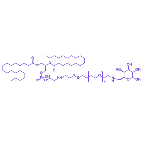 分子结构与功能协同:该材料由磷脂成分DSPE、动态共价键双硫键(SS)、亲水性链段PEG及靶向配体半乳糖(galactose)构成。DSPE作为膜材基础单元,可参与脂质体、纳米颗粒等载体的构建,赋予材料良好的膜融合能力,有助于载体与细胞膜的相互作用;双硫键(SS)具有还原敏感性,在细胞内高浓度谷胱甘肽环境中可迅速断裂,实现药物或功能分子的时空可控释放;PEG链段能显著增强材料的水溶性,降低免疫原性并延长体内循环时间,减少非特异性清除;半乳糖作为靶向配体,可特异性识别并结合肝细胞(hepatocyte)表面高表达的去唾液酸糖蛋白受体(ASGPR),从而介导载体向肝脏(hepar)的主动靶向递送。