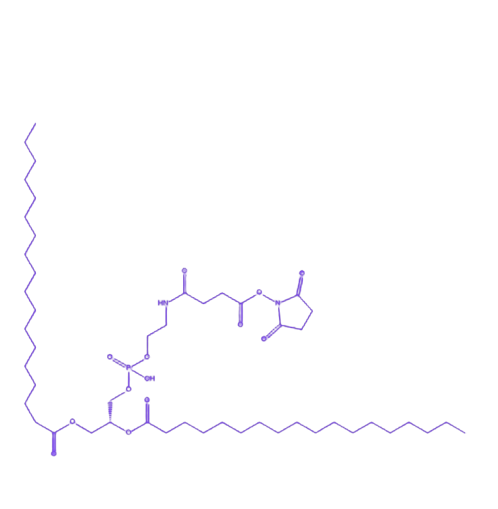 DSPE-NHS(二硬脂酰磷脂酰乙酰胺-N-羟基丁二酰亚胺)是基于DSPE(1,2-二硬脂酰基-sn-甘油-3-磷酸乙醇胺)的改性磷脂衍生物,其分子结构中磷酸基团末端连接有伯氨基(-NH₂),可通过化学修饰与含活性基团的化合物偶联。作为脂质体合成的常用饱和18碳磷脂,DSPE常通过连接PEG(聚乙二醇)形成如DSPE-PEG等衍生物,进而在PEG末端引入MAL、NHS、COOH、NH₂、Biotin等活性基团,但此类修饰依赖大分子PEG的介入。 针对实验中对大分子存在的限制需求,可直接对DSPE末端的伯氨基进行改性修饰,无需引入PEG即可获得带有NHS、COOH、N₃、MAL、Thiol(SH)、OPSS、FITC、FA、Biotin等多种活性基团的衍生物,从而满足不同生物偶联、药物递送及纳米载体构建等场景的应用要求。