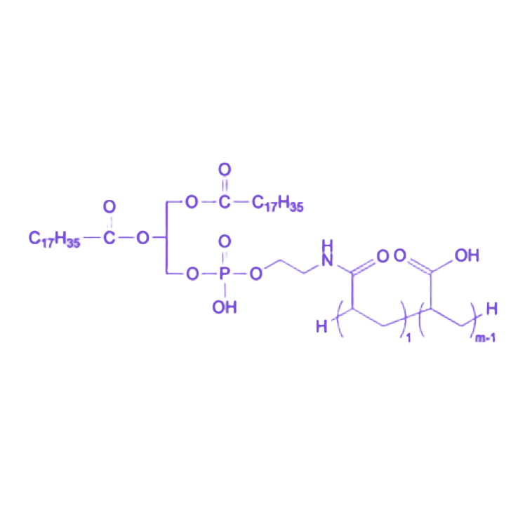 1,2-二硬脂酰基-sn-甘油-3-磷酸乙醇胺-聚丙烯酸(DSPE-PAA)是一种具有多领域应用价值的功能性化合物,其分子结构中聚丙烯酸(PAA)片段通过丰富的羧基官能团赋予材料独特的理化特性与反应活性,同时显著提升整体分子在水相体系中的溶解与分散能力。 PAA链段的结构特征决定了其核心性能:大量羧基官能团不仅提供优异的亲水性,实现与水分子的高效结合,还具备极高的化学反应活性,可参与离子交换反应(如与金属离子交换改变溶液离子组成)及络合反应(形成稳定金属络合物)。通过调控聚合反应条件(如反应温度、压力、单体浓度),可精准控制PAA的聚合度与分子链长度,进而实现对其溶解性、黏度等物理化学性质的定制化调节,使材料功能表现随结构参数变化呈现多样化特征。 DSPE-PAA的复合结构设计通过PAA的亲水特性有效改善了传统脂质衍生物在水相中的分散局限,为其在生物医用载体、智能响应材料、催化体系等领域的应用提供了关键性能支撑,展现出从基础研究到工业应用的广泛潜力。