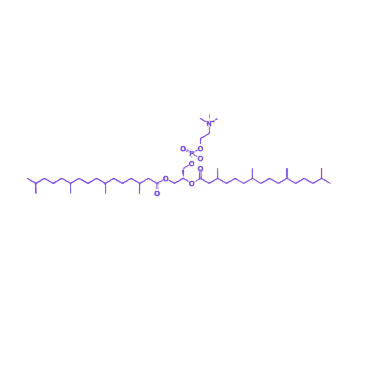 DPhPC(二植酰磷脂酰胆碱)是一种具有明确分子结构和优良生物物理特性的合成磷脂,其双亲性结构使其成为构建人工脂质双层体系的关键材料,在生物膜相关研究中具有重要应用价值。 分子结构以甘油骨架为核心,1,2位通过酯键连接两条植烷酰基(3,7,11,15-四甲基十六烷酰基)脂肪酸链,3位则通过磷酸酯键连接磷酸胆碱基团,形成典型的双亲性分子结构:亲水的磷酸胆碱头部与疏水的植烷酰基尾部构成分子的基本功能单元。 分子中存在多个手性中心,赋予其构象上的立体特异性,使其在人工膜体系中更接近天然磷脂的空间排布,从而显著提升与生物分子的兼容性,为模拟生物膜微环境提供结构基础。 由DPhPC构建的合成双层囊泡(如脂质体)具有优异的物理化学性质,在无孔道或离子通道存在的条件下,展现出极低的离子泄漏率和良好的离子阻隔性,可有效维持膜两侧的电化学梯度,为研究通道蛋白的门控机制、膜蛋白的构象变化及跨膜物质转运等生理过程提供稳定的模型体系。