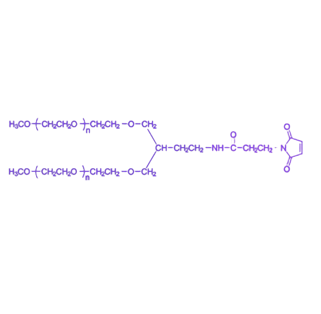 2-Arm PEG-MAL(双臂马来酰亚胺聚乙二醇)是一种具有对称结构的聚乙二醇衍生物,其分子中心通过丙烷或三羟甲基丙烷连接核分支出两条PEG链,末端均修饰马来酰亚胺(Maleimide)活性基团。该化合物整合了PEG的高亲水性与MAL基团的高选择性反应活性,是构建巯基反应体系与生物偶联的关键中间体,在生物医学及材料科学领域具有重要应用价值。 分子结构特征:以丙烷或三羟甲基丙烷为核心骨架,对称分支出两条线性PEG链,双末端均共价连接马来酰亚胺功能团,形成双活性位点结构。这种设计使其可同时参与双位点修饰或构建交联网络,与单臂PEG-MAL相比能形成更稳固的三维空间结构。 化学特性与反应性能:具有优异的水溶性和化学稳定性,在中性至弱酸性环境中保持结构稳定,强碱或强氧化条件下易发生马来酰亚胺环开裂。马来酰亚胺基团能与含巯基(–SH)的生物分子发生高效迈克尔加成反应,生成稳定的硫醚键,该反应具有反应条件温和(通常在pH 6.5-7.5范围内进行)、选择性强、副反应少的特点,为生物分子修饰提供可控的共价偶联途径。 应用领域:广泛应用于生物偶联、药物载体修饰、纳米颗粒表面功能化及水凝胶交联体系。在抗体药物偶联物(ADC)制备中,可实现抗体与小分子药物的精准连接;用于长效蛋白药物修饰时,能延长半衰期并降低免疫原性;在细胞表面修饰及靶向纳米药物递送系统构建中,通过巯基反应实现生物分子的定向固定。此外,还可作为交联剂用于合成刺激响应性水凝胶和可降解生物材料网络,在组织工程、细胞成像及生物传感器等前沿领域展现出持续扩展的应用潜力。