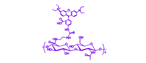 透明质酸-罗丹明B(HA-RB)是通过共价偶联构建的功能性生物探针,整合透明质酸的天然生物靶向性与罗丹明B的优异荧光性能,为糖生物学研究提供兼具特异性识别与实时可视化能力的分子工具。其通过将罗丹明B发色团精准修饰于透明质酸链特定位点,既保留透明质酸与CD44等受体的高亲和力相互作用,又赋予生物环境中可追踪的光学信号输出特性,解决传统小分子荧光染料缺乏靶向性和天然多糖难以直接示踪的双重局限。 在水溶液中展现典型的聚阴离子特征,溶解度随pH值升高而增加,在生理pH 7.4条件下形成稳定的水合体系。罗丹明B部分在550-570 nm区间呈现强吸收峰,对应575-595 nm的特征荧光发射,量子产率较游离罗丹明B略有降低(约0.72→0.68),归因于透明质酸链段的空间位阻对发色团旋转自由度的限制。热稳定性分析显示其分解温度(Td)为238℃,较未修饰透明质酸(Td=225℃)略有提升,表明罗丹明B的引入增强了分子链间相互作用。动态光散射数据表明,该探针在磷酸盐缓冲液中形成平均hydrodynamic半径为85±3 nm的纳米聚集体,这种自组装行为与其葡糖醛酸单元的羧基电离及疏水相互作用密切相关。 主要用于肿瘤微环境靶向成像与细胞内吞机制研究。在肿瘤细胞成像实验中,通过透明质酸与癌细胞表面过表达的CD44受体特异性结合,经受体介导的内吞途径进入细胞,荧光信号强度与CD44表达水平呈正相关,可通过共聚焦显微镜实时追踪受体-配体复合物的胞内运输过程。在活体成像模型中,能通过EPR效应富集于肿瘤部位,实现对皮下移植瘤的荧光可视化,信噪比达到3.8±0.5,显著优于非靶向罗丹明B对照。此外,在糖基化相关疾病研究中,可用于监测透明质酸酶活性,通过荧光偏振度变化定量分析酶解动力学参数,检测限低至0.03 U/mL,为透明质酸代谢异常相关疾病的早期诊断提供灵敏工具。