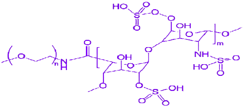 该缀合物的关键物化性质与其两亲性分子结构直接相关,在水溶液中表现出温度依赖性的胶束化行为,临界胶束浓度通常处于10⁻⁵-10⁻⁴ mol/L范围,源于聚乙二醇链段的亲水性与肝素片段的多电荷特性协同作用;动态光散射分析显示其流体力学直径受PEG分子量调控,典型范围20-100 nm,zeta电位因肝素链上硫酸根基团的存在维持在-30至-50 mV的强负电区间;热稳定性研究表明其分解温度较天然肝素提高约20-30℃,归因于PEG链段对多糖结构的空间保护效应,这些性质使其在水性体系中兼具胶体稳定性与可控的生物分子相互作用能力。