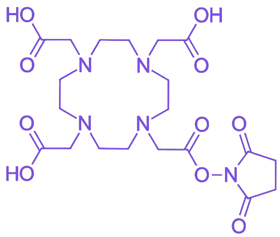 通过将DOTA的螯合功能与NHS的偶联活性进行分子整合,DOTA-NHS ester实现了对生物分子的金属离子标记功能:首先利用NHS酯基团与含伯胺的生物分子共价结合,再通过DOTA部分螯合金属离子,从而构建兼具靶向性与示踪/治疗功能的生物缀合物,在核医学成像、放射免疫治疗等前沿领域展现出广阔应用前景。