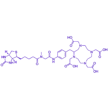 DOTA-Biotin 是通过特定化学反应将大环螯合剂四氮杂环十二烷四乙酸(DOTA)与水溶性维生素生物素(Biotin)连接形成的功能性化合物,部分情况下可引入 PEG 等连接子以优化其分子稳定性与水溶性。该产物兼具 DOTA 的金属螯合特性与生物素的生物活性,在生物医学及化学研究领域具有独特应用价值。 DOTA 作为核心螯合单元,其分子结构中含有的四个氮原子和四个乙酸基团赋予其与多种金属离子高亲和力结合的能力,尤其对 镧系元素离子 及 镓、铟等过渡金属离子 可形成热力学稳定的络合物,这一特性使其在放射性药物制备和医学成像探针开发中发挥关键作用。生物素组分作为生物素依赖性酶的必需辅酶,广泛参与细胞内蛋白质、碳水化合物及脂类的代谢过程,同时在细胞信号传导、葡萄糖合成调控及生物体生长发育等生理活动中承担重要功能。 通过化学修饰实现的 DOTA 与生物素的共价偶联,使 DOTA-Biotin 能够在保持金属离子络合能力的同时,借助生物素与亲和素/链霉亲和素系统的高特异性相互作用,实现靶向分子标记、生物样品分离纯化或生物活性分子的定向递送,为生物分析、药物研发及临床诊断等领域提供高效工具。