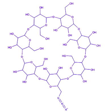 βCD-叠氮是通过化学修饰将 叠氮基团(-N3)引入β-环糊精分子结构形成的功能性衍生物。其母体β-环糊精为由7个葡萄糖单元通过α-1,4-糖苷键连接构成的环状低聚糖,具有内疏水、外亲水的独特空腔结构,可通过疏水性内腔包合客体分子,显著改善其溶解性、稳定性及生物利用度。叠氮基团的引入赋予分子高反应活性,尤其可参与 点击化学反应(如叠氮-炔烃环加成),该反应具有条件温和、产率高、副产物少的优势。 βCD-叠氮同时保留β-环糊精的分子识别与包合能力,叠加叠氮基团的化学修饰潜力,可实现多功能集成。其疏水空腔能选择性包结各类有机小分子、药物或纳米颗粒,而叠氮基团可作为活性位点与含炔基化合物发生高效偶联,在 化学合成中用于构建复杂分子,在 材料制备中实现功能涂层或聚合物接枝,在 生物医学领域可用于药物递送系统构建、生物分子标记及靶向治疗载体开发。