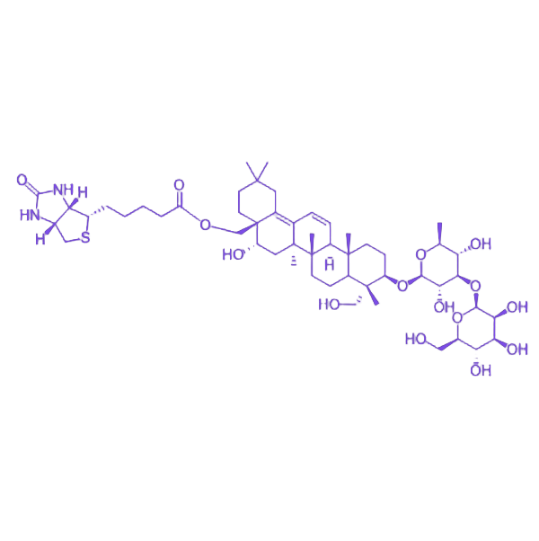 生物素-柴胡皂苷B2是通过化学方法将生物素与柴胡皂苷B2连接形成的功能性复合物,该设计旨在整合两种成分的独特优势,为生物医学研究及化合物开发提供创新工具与候选分子。 柴胡皂苷B2作为从柴胡中分离的主要活性成分,具备多种已报道的药理活性,是天然产物研究中的重要对象。生物素作为水溶性维生素,不仅在生物体内发挥关键辅酶作用,其与特定生物素结合蛋白或受体的特异性结合能力赋予该复合物良好的靶向性。通过化学偶联实现的复合结构,使生物素的靶向识别特性与柴胡皂苷B2的药理活性得以协同发挥,为精准递送、靶向研究及相关药物开发奠定了物质基础。