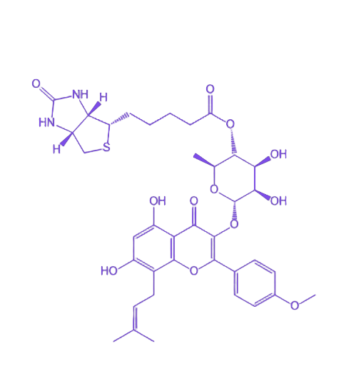 Biotin-baoshoside I 是一种将生物素的标记功能与宝藿苷 I 的生物活性相结合的复合物,在生物医化合物研究领域具有重要应用价值。它通过生物素标记实现对宝藿苷 I 在体内代谢过程和作用靶点的追踪,为阐明其化合物理机制提供关键技术支持。 其分子结构由生物素的活性基团(如羧基)与 baoshoside I 的合适反应位点(如羟基、氨基等)通过共价键连接形成。这种连接方式会改变二者原有官能团的电子云分布和化学环境,进而对其化学反应活性产生影响。 该复合物的稳定性表现为在常温、干燥、避光条件下相对稳定,但对光、热、酸碱环境较为敏感。光照可能引发分子的光化学反应导致结构变化,高温会加速分子运动促使其分解,而在强酸或强碱环境中,连接生物素和 baoshoside I 的化学键可能发生断裂,造成二者分离。