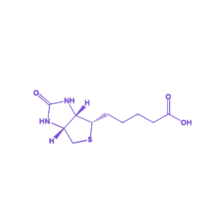 D-生物素作为一种水溶性B族维生素,在生物体代谢及科研领域具有双重重要价值。其核心功能在于作为羧化酶辅酶参与碳水化合物、脂肪和蛋白质的代谢过程,同时凭借与抗生物素蛋白(如链霉亲和素)的高特异性结合特性(解离常数达10⁻¹⁵ mol/L),在分子生物学研究中发挥关键作用。 在化学性质方面,D-生物素表现出一定的环境敏感性:在常温中性pH条件下相对稳定,但对强酸、强碱、氧化剂及高温较为敏感,例如碱性溶液加热会导致结构破坏并丧失生物活性。分子结构中的脲基是与生物素结合蛋白特异性结合的关键位点,而戊酸侧链羧基则可通过酯化、酰胺化等反应实现分子修饰与标记,为功能化衍生提供化学基础。 该特性使其在生物医学研究中得到广泛应用,包括但不限于免疫检测、核酸杂交及蛋白质纯化等实验场景。通过D-生物素标记的分子探针,可利用抗生物素蛋白的高亲和力结合特性,实现目标分子的高效检测、精准分离与富集,为生命科学研究提供可靠的技术支撑。