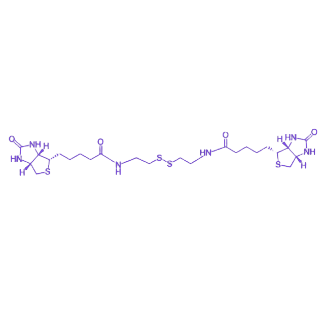 biotin-SS-biotin是一种胺反应性生物素化试剂,其分子结构由两个生物素分子通过一个二硫键连接而成。生物素作为水溶性维生素(维生素B7/辅酶R),具有环状结构,可与亲和素或链霉亲和素发生高亲和力、高专一性的特异性结合;二硫键则具备可断裂特性,在还原环境中可被裂解为两个硫醇基团(-SH),实现连接的生物素部分解离。该试剂通过生物素基团与目标分子氨基的反应形成稳定酰胺键,适用于需要可逆生物素标记的实验场景,为生物分子的分离、检测及功能研究提供灵活工具。 其核心功能基于双硫键的环境响应性断裂与生物素-亲和素系统的特异性相互作用协同实现。生物素部分的环状结构确保结合位点的精确识别,而二硫键的动态特性允许在还原条件下(如加入还原剂)解除标记,这种可控性使得标记过程具备可逆调节能力。试剂的胺反应性使其能与含游离氨基的生物分子(如蛋白质、多肽等)高效偶联,形成稳定的共价连接,同时保留目标分子的生物活性。 在应用中,biotin-SS-biotin可用于生物分子的可逆标记与纯化,通过亲和素/链霉亲和素介质实现目标物的特异性捕获,经还原处理后释放,避免传统不可逆标记对生物分子功能的潜在影响。其化学结构设计兼顾反应效率与可控性,为生命科学研究中的蛋白质组学分析、受体结合研究及生物制药开发等领域提供可靠的技术支持。