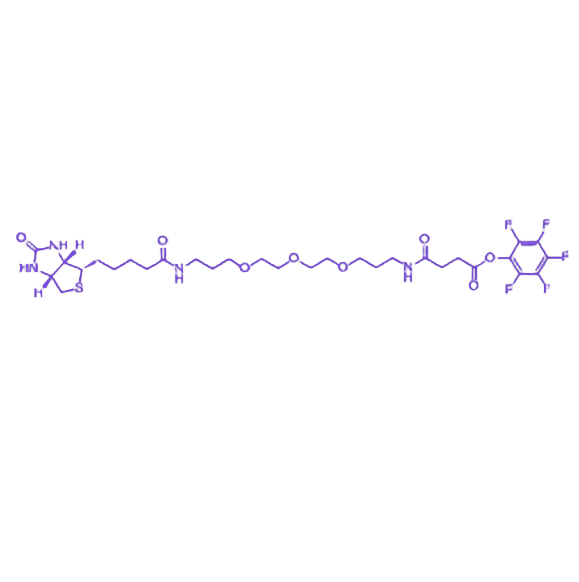 TFP-PEG3-Biotin(Tetrafluorophenyl-PEG3-Biotin)是一种以四氟苯酯(TFP Ester)为活化基团的生物素化修饰试剂,由高亲和力生物素识别组分、三重复聚乙二醇链段(PEG3)及TFP活性酯构成,兼具高反应活性、水相稳定性、低结构干扰性和高亲和识别保留度,是蛋白生物素化体系中兼顾灵敏度与结构完整性的优选标记工具。 其核心结构特点在于TFP酯与氨基的偶联效率高于常规NHS酯,且具有更优的水稳定性,可在含水体系中保持较长反应活性,适用于对水敏感体系或需要温和反应条件的蛋白修饰应用。PEG3链段作为柔性间隔臂(Spacer),能使生物素与蛋白质主体保持适当空间距离,减少标记对蛋白质天然结构、活性中心及蛋白-蛋白相互作用区域的影响,相比PEG0或无间隔臂试剂,可显著提高生物素暴露度,更利于与链霉亲和素(Streptavidin/Avidin/NeutrAvidin)形成稳定高亲和复合物。 反应机理为TFP酯与赖氨酸残基或蛋白N端氨基发生酰胺键形成反应,生成稳定不可逆连接结构。由于TFP酯水解速率低,允许更灵活的反应时间和实验操作,减少失活损耗;PEG3链段同时有效提升水溶性,使其适合在PBS、HEPES等温和缓冲液中进行蛋白修饰。