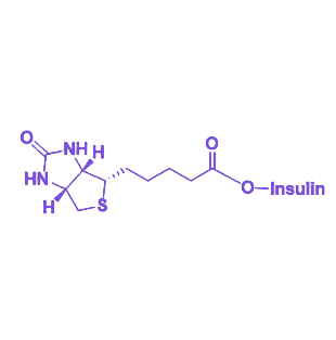 Biotin-Insulin 是通过共价键将生物素分子连接于胰岛素形成的功能性衍生物,其核心价值在于利用生物素与亲和素系统的高亲和力相互作用,为胰岛素的检测分析及机制研究提供高效工具。胰岛素作为胰腺分泌的关键激素,通过调节血糖水平维持机体能量代谢稳态,而生物素标记修饰进一步拓展了其在生物医学领域的应用维度。 该衍生物通过特定化学方法实现精准修饰,既保留胰岛素分子的生物学活性基础,又赋予其与亲和素探针特异性结合的能力。这种双重特性使其成为研究胰岛素受体结合特性与功能的理想试剂,可助力解析胰岛素信号通路的分子机制。同时,借助生物素标记的示踪特性,能够动态跟踪胰岛素在体内的分布代谢过程,为糖尿病治疗药物的研发提供关键实验数据支持。