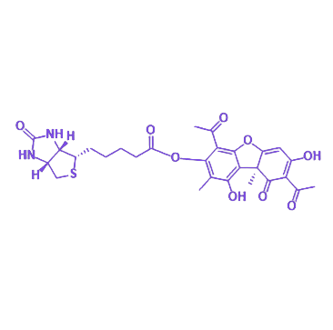 Biotin-D-lichen acid 是通过化学方法将 生物素 与 D-地衣酸 共价连接形成的功能性化合物,该分子设计兼顾了两种组分的核心特性,在生物医学及相关领域具有多维度应用潜力。 生物素作为水溶性维生素(又称维生素 H 或辅酶 R),其关键特征在于能与 亲和素 或 链霉亲和素 形成高稳定性非共价键复合物,这一特异性相互作用被广泛应用于生物分子分离纯化、靶向检测及药物递送系统构建。D-地衣酸是地衣类植物特有的次级代谢产物,具备 抗菌、抗病毒及 抗炎 等多种生物活性,为化合物提供了显著的药理功能基础。 通过结构修饰实现的分子整合,使 Biotin-D-lichen acid 既保留了生物素对亲和素类蛋白的高亲和识别能力,可作为分子探针或靶向载体用于生物样本分析与精准递送;同时继承了 D-地衣酸的天然生物活性,为其在抗感染、炎症调控等治疗场景中的应用奠定基础。该化合物的设计理念为构建兼具靶向识别与药效功能的新型生物活性分子提供了创新思路。