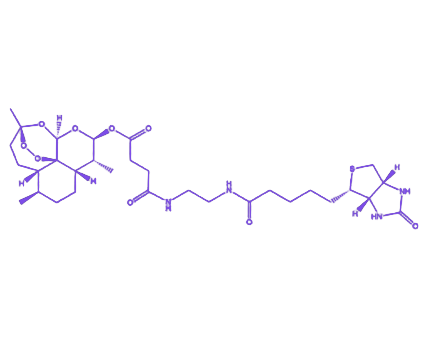 Artesunate-Biotin(青蒿琥酯偶联生物素)是通过严谨化学反应将青蒿琥酯与生物素共价连接形成的功能性复合物,其分子结构整合了两种成分的核心特性,兼具抗疟活性与生物标记功能,并通过化学键合提升了生物稳定性,延长体内作用时效。 青蒿琥酯作为复合物的活性主体,凭借其明确的抗疟效能,可特异性靶向疟原虫,通过干扰其关键生理代谢路径实现对虫体生长繁衍的强力遏制。生物素作为必要维生素,不仅参与脂肪酸合成、碳水化合物代谢等基础生物化学反应以维持机体正常功能,更因其独特的化学结构与生物学特性,成为生物学研究及生物医学检测领域中理想的生物标记分子,可实现对特定生物分子或细胞的精准追踪与识别。 该偶联复合物通过化学键将青蒿琥酯与生物素紧密连接,显著提升了分子的结构稳定性,使其能够有效抵御生物环境中的酶解作用及化学干扰,从而延长青蒿琥酯在体内的作用时长,确保药效释放更持久、更稳定,为相关领域的应用提供了优化的分子基础。