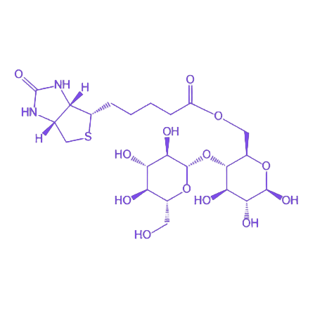 Biotin-cellobiose是一种融合生物素标记功能与纤维二糖生物特性的功能性复合物,其核心价值在于借助生物素-亲和素系统的特异性结合能力,实现对含纤维二糖结构物质的代谢追踪与微生物相互作用机制研究。生物素组分赋予复合物高效的生物分子标记与信号放大潜能,广泛适用于细胞成像等追踪场景;纤维二糖作为纤维素的基本结构单元,为探究生物体糖类代谢途径及宿主-微生物共生关系提供了天然分子探针。 该复合物在常温、干燥及避光条件下可保持相对稳定,但对外部环境因素表现出显著敏感性。温度升高可能诱发分子分解反应,导致整体结构破坏;持续光照易引发光化学反应,改变化合物的理化性质;在强酸或强碱条件下,连接生物素与纤维二糖的化学键(如糖苷键)易发生水解断裂,造成两者分离及纤维二糖结构降解。 基于其独特的分子设计,Biotin-cellobiose在生物医化合物研究领域具有重要应用前景,可作为工具分子深入解析纤维二糖衍生物在生物体内的动态代谢过程,揭示其与肠道微生物或环境菌群的特异性互作机制,为糖类药物研发及微生物生态学研究提供技术支撑。