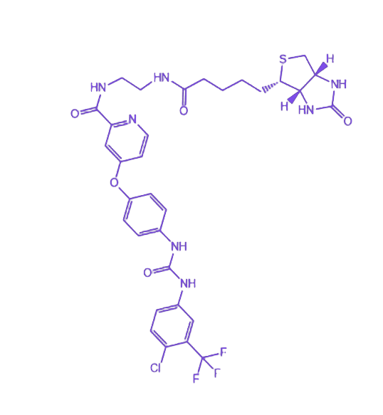 索拉菲尼-生物素是由多激酶阻止剂索拉菲尼与水溶性维生素生物素通过特定方式结合形成的化合物,兼具两者核心特性,在生物医学领域具有潜在应用价值。索拉菲尼通过抑制多种激酶活性干扰肿瘤细胞的生长与增殖过程,生物素则凭借对链霉亲和素和亲和素的高亲和力,可实现化合物的靶向递送,从而提升作用效果并降低副作用,同时该化合物也可作为生物标记物用于生物检测与判断。 该化合物的稳定性受索拉菲尼与生物素各自化学特性的共同影响。在酸碱稳定性方面,索拉菲尼因分子中含有多个芳环和杂环结构而相对稳定,但在强酸或强碱条件下可能发生结构破坏;生物素在中性和弱酸性条件下稳定,在碱性条件下会缓慢分解;因此索拉菲尼-生物素在中性至弱酸性环境中相对稳定,在强酸碱条件下可能发生水解等反应。氧化稳定性方面,索拉菲尼分子中的氨基等基团可能被氧化,而生物素相对较稳定,故索拉菲尼-生物素整体对氧化有一定敏感性,在储存和使用过程中需注意避免与强氧化剂接触。